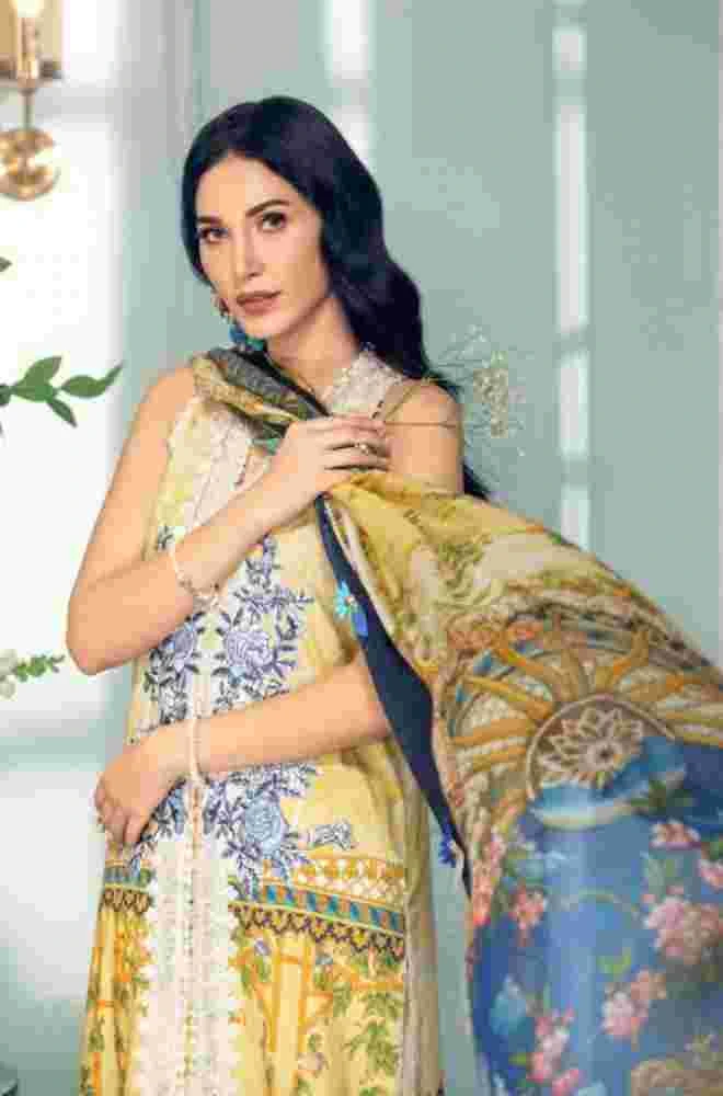 Summer/Spring Collection Printed Shirt with Neckline Embroidered Printed Chiffon Dupatta Dyed Lawn Trouser with Patch