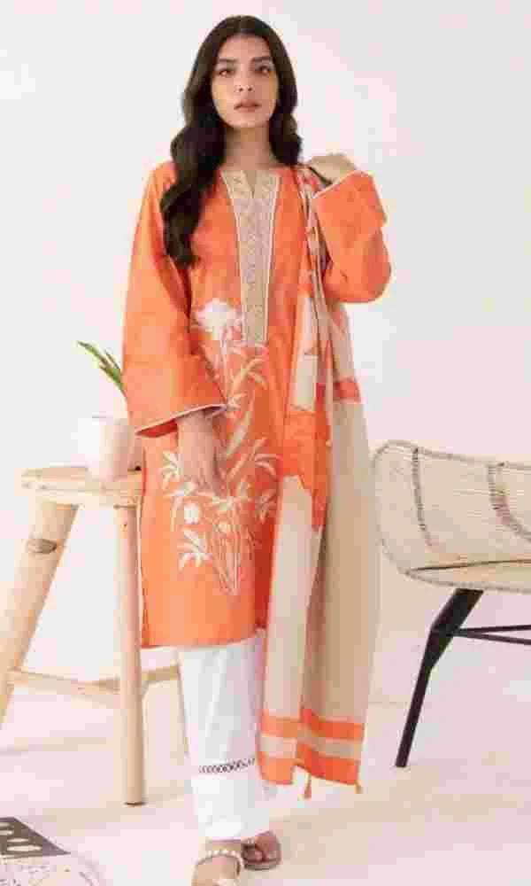 3Pc Neckline Embroidered Shirt with Printed Chiffon Dupatta (D)