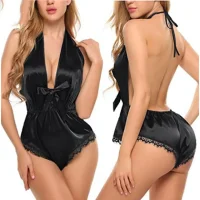 Baby Doll 3pcs Lace Long Slip Sleepwear Rose Bunch Nightwear – Black