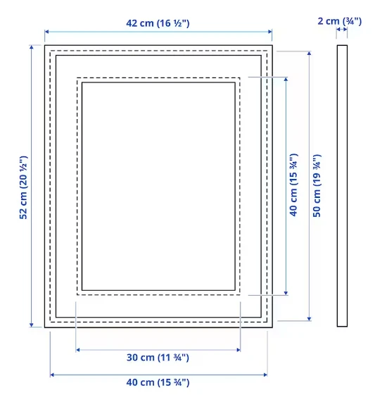 This frame fits with a picture that has dimensions 30×40 cm if you use it with the mount, and it fits with a picture that has dimensions 40×50 cm if you choose to use the frame without the mount.