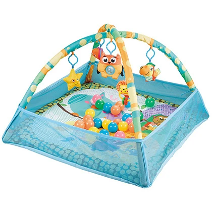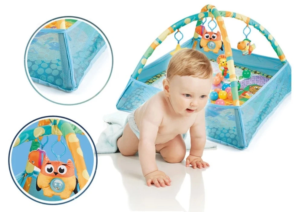 Play Gym for Baby Gym is a colorful play gym with fun characters and entertaining toys, including a plush cat. Toy loops are located on the mat for attaching additional toys. Ideal for children up to 2 years, this mat will provide comfort for your baby during play. play Gym comes with 3 ways to play. Also be used as tummy time play mat. Large play area features fun characters. Included with Ring rattle, colorful bead chaser and soft padded toy bars.