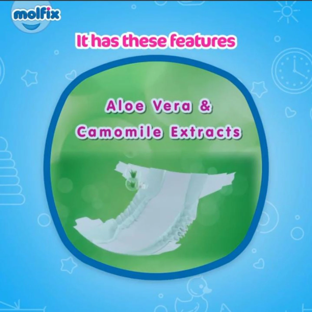 All mums will agree that ‘A happy baby equates a happy Mum’. At Molfix Diapers, we believe that babies are the leaders of tomorrow and keeping them happy and free goes a long way in fostering their development. Our diapers guarantee these and so much more because of its anatomic structure and other features detailed below.Extra absorbent green layer, soaking up all your baby’s pee