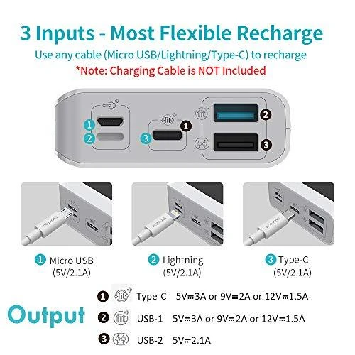 Most Convenient Charging: Micro-USB, l i g h t n i n g and USB Type-C provides high convenience of recharging this power bank, only one cable to get the power bank recharged or charge your devices. (Note: Charging Cable is NOT included.)