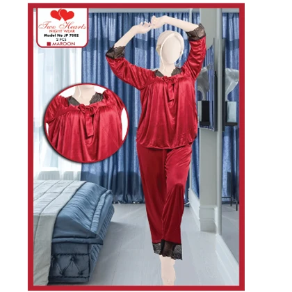 Two Hearts 2-Piece Silk Nightwear With Ribbon For Girls & Women – Black