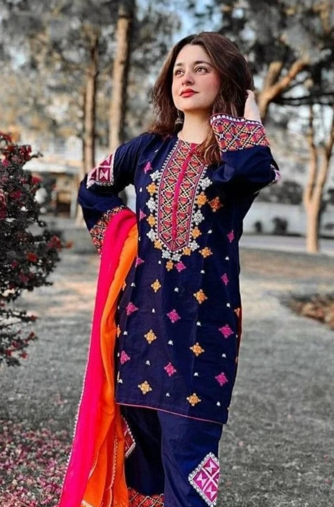 Embroidered 90*70 airjet Lawn Shirt tie dye Bamber Pure Embroidered Duppata Embroidered 90*70 airjet Lawn trouser Linen Dyed Backside