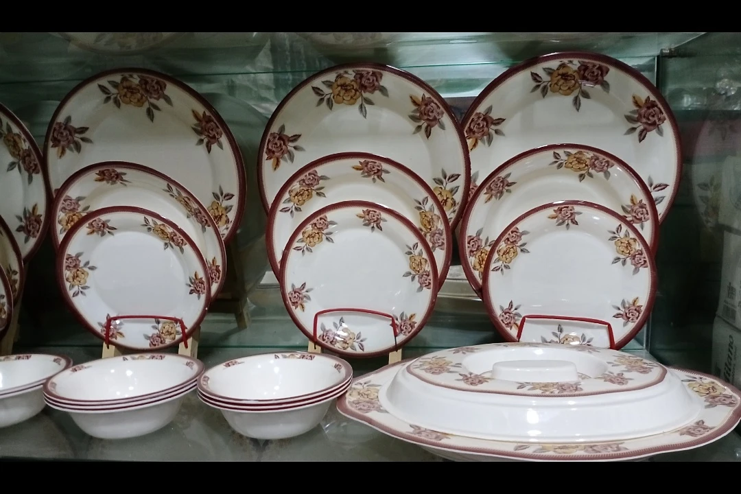 8 Flat Plates , 8 Deep Plates , 8 Small Plates , 8 Sweat Bowl , 2 Donga with (Dhakan) , 1 Donga Without Dakan , 2 Rice Dishes , 2 Salan Spoon , 2 Rice spoon , 8 Plastic spoons and other pieces etc.
