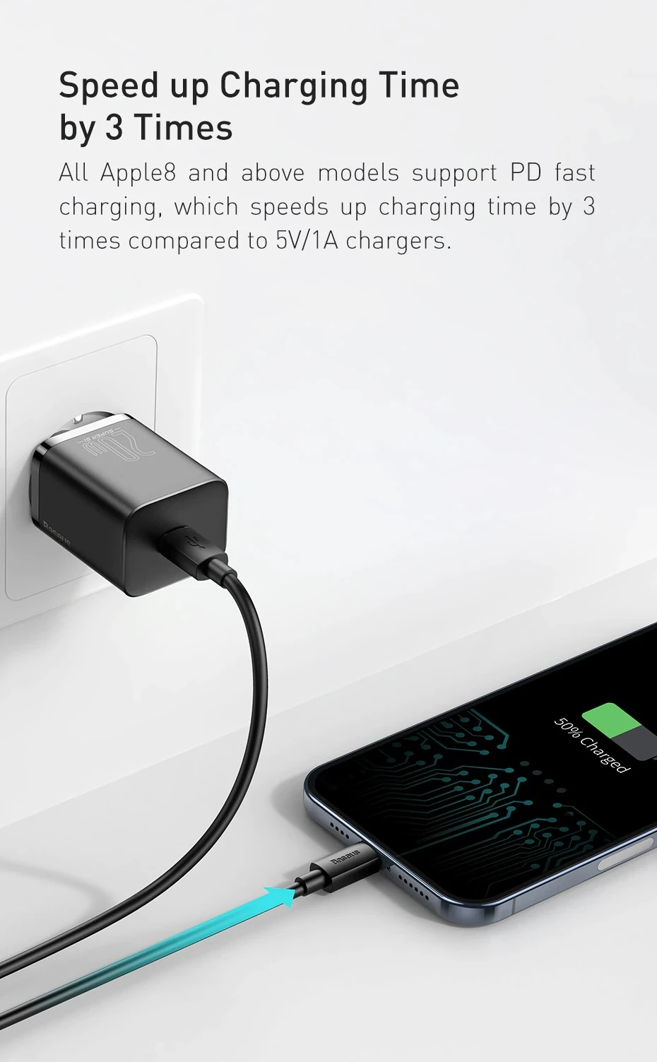 All iPhone 8 and above models support PD fast charging, which speeds up charging time by 3 times compared to 5V/1A chargers.