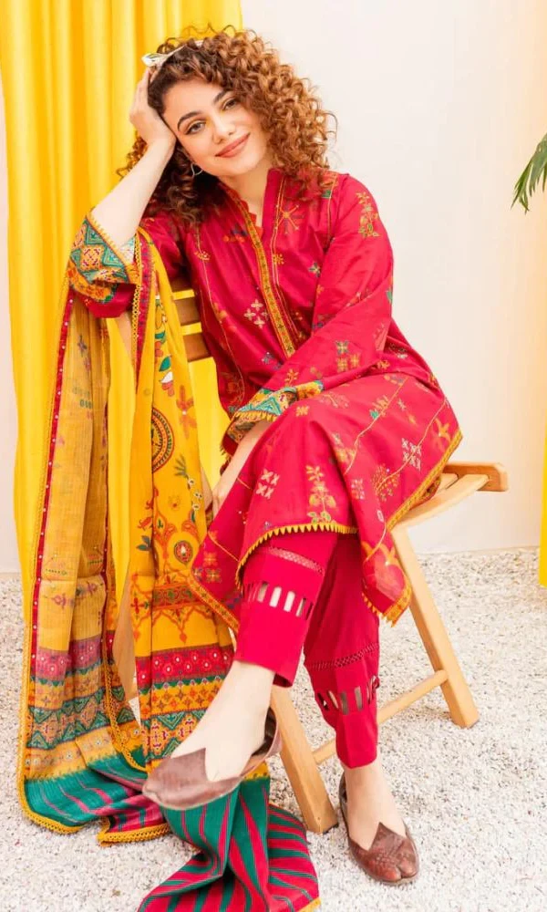 1 embroidered front for shirt, 1 embroidered piece for both sleeves, 1 dyed back, 1 dyed trouser, 1 printed Organza dupatta.