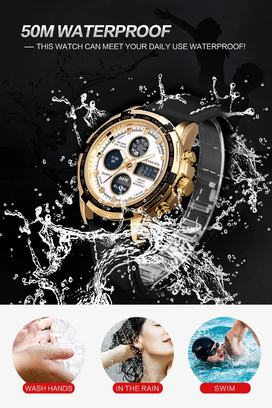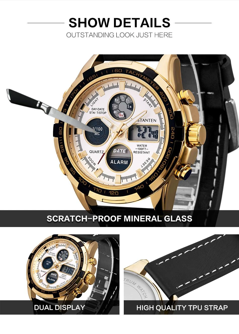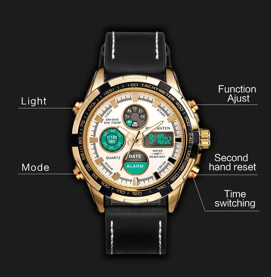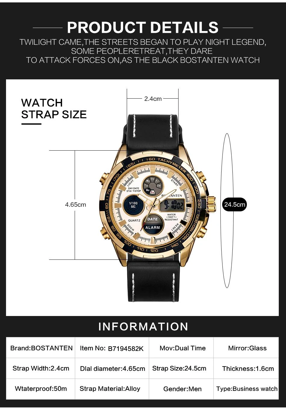 BOSTANTENMovement: QuartzDial Material:AlloyDial Diameter:4.65cm3 Features: ✔ Luminous ✔Complete Calendar ✔Shock & Water Resistants