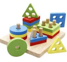 It includes 4 different shapes each 4 colorsblock. Pegs from 1-4. Using the shape outlines on the board, children can match the pieces to the outlines and stack them on the pegs.