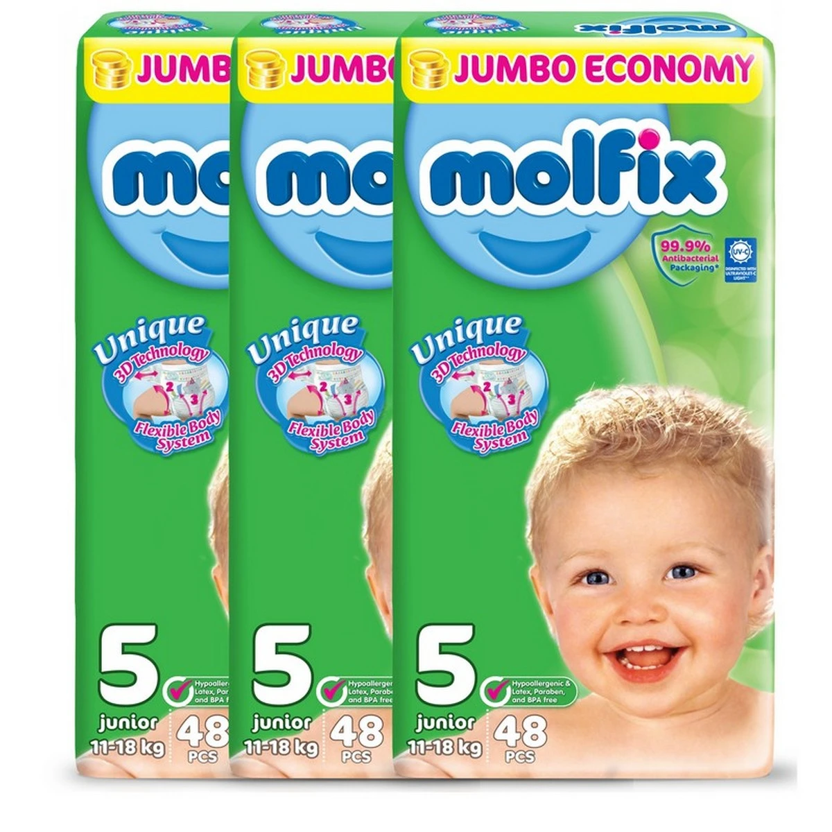 Pack Of 3, Molfix Diaper, Size 5, Junior, 11-18Kg, 48Pcs Jumbo Packs