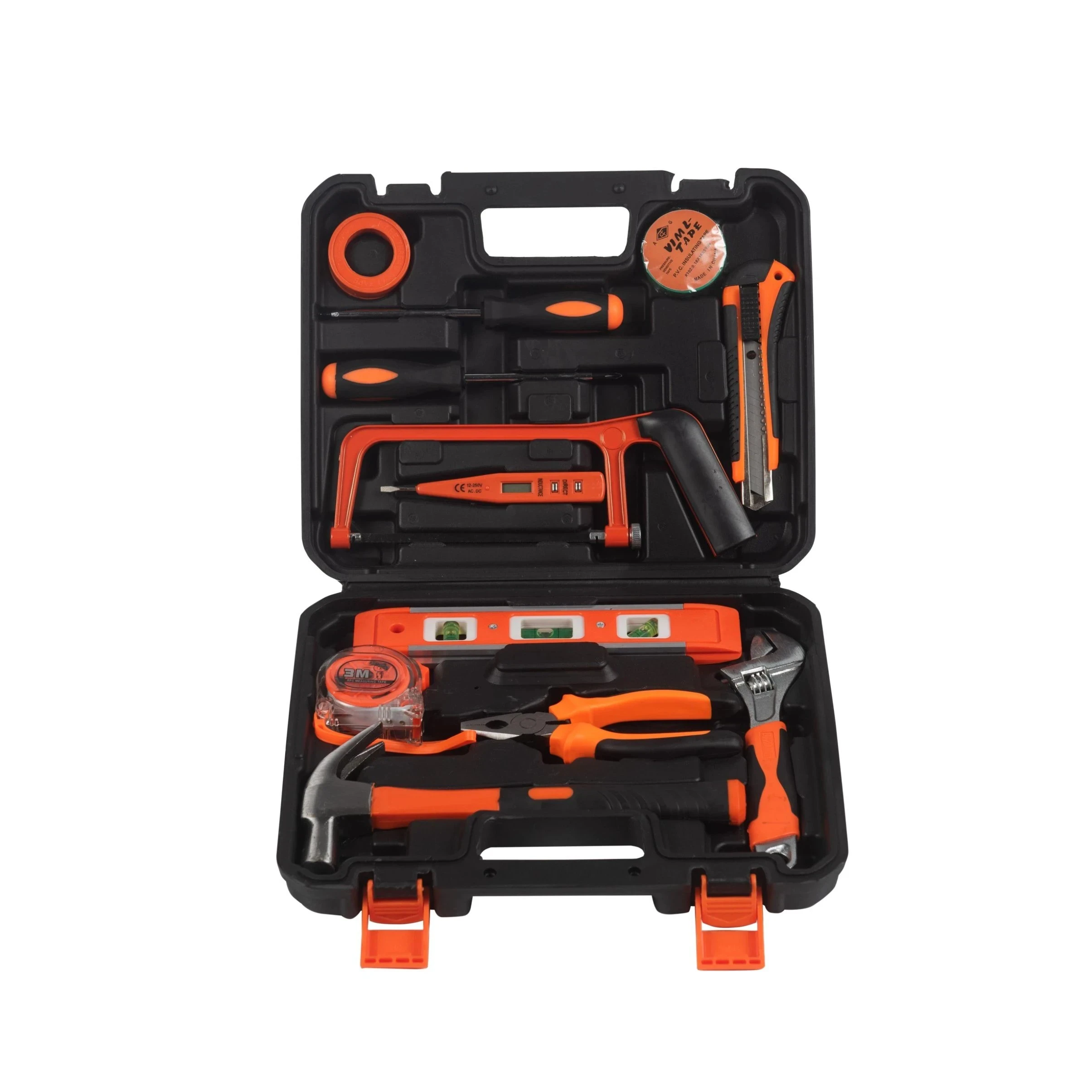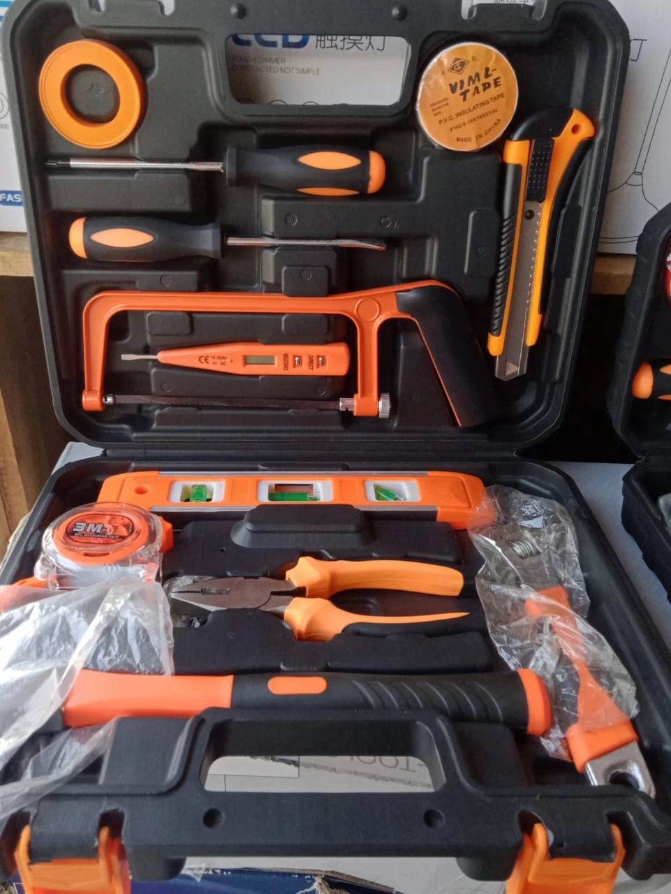 1.5-6 inner socket wrench set Electric tape Extension bar 2.5”-“type screw driver 2.5 cross type screw driver 10pcs 25mm short bit sets Utility knife Mini saw Digital electro probe 3M transparent tape 3,4,5 expansion pipe, screw sets 5pcs blade sets 6inch cutting pliers 8inch adjustable wrench Long handle hammer