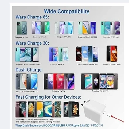 Tech SpecsColorWhiteMaterialPCDimensions55*33*56.5 mmWeight118gInput100-240V~ 50/60Hz 1.8AOutput5.0V 3.0A or 10.0V 6.5A (65.0W MAX)PDO:5.0V 3.0A / 9.0V 3.0A / 12.0V 3.0A / 15.0V 3.0A / 20.0V 2.25APPS:3.3-16.0V 3.0A MAX (45.0W MAX)Port TypeUSB-CIn the BoxOnePlus Warp Charge 65 Power AdapterCompatibilityWarp Charge 65: OnePlus 8T / 9 / 9 Pro / Nord 2 5GWarp Charge 30: OnePlus 7 Pro / 7T / 7T Pro / Nord / N10 / Nord CE 5GFast Charge: OnePlus 3 / 3T / 5 / 5T / 6 / 6T / 7 / N100TipsThe OnePlus Warp Charge 65 Power Adapter supports Warp Charge 65, Warp Charge 30, OnePlus Fast Charge and regular charging speed of other devices. The power output depends on the device the charger is connected to. Please charge Warp Charge 65-enabled devices exclusively with the official OnePlus Warp Charge 65 Power Adapter and OnePlus Warp Charge Type-C to Type-C Cable. Results are taken from official OnePlus tests under lab conditions. Actual figures may vary in real-life usage.