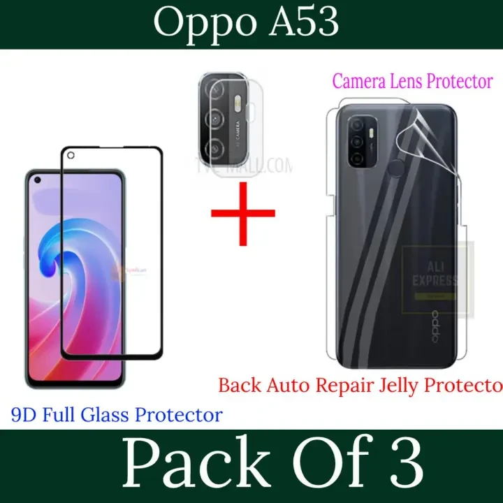 Product details of Pack of 3- Oppo A53 9D 21D Tempered Glass Black Border Transaprent Screen Protector + Back Clear Jelly/ Matte Anti-Slip Protector Soft Skin Sheet Film Protection + 9H Flexible Camera Lens Protector For Oppo A53 – Transparent