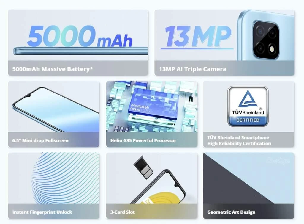 NETWORK Technology GSM / HSPA / LTELAUNCH Announced 2021, March 05Status Available. Released 2021, March 05BODY Dimensions 165.2 x 76.4 x 8.9 mm (6.50 x 3.01 x 0.35 in)Weight 190 g (6.70 oz)Build Glass front, plastic back, plastic frameSIM Dual SIM (Nano-SIM, dual stand-by)DISPLAY Type IPS LCD, 400 nits (typ)Size 6.5 inches, 102.0 cm2 (~80.8% screen-to-body ratio)Resolution 720 x 1600 pixels, 20:9 ratio (~270 ppi density)PLATFORM OS Android 10, Realme UIChipset MediaTek MT6765G Helio G35 (12 nm)CPU Octa-core (4×2.3 GHz Cortex-A53 & 4×1.8 GHz Cortex-A53)GPU PowerVR GE8320MEMORY Card slot microSDXC (dedicated slot)Internal 32GB 3GB RAM eMMC 5.1MAIN CAMERA Dual 13 MP, f/2.2, 26mm (wide), 1/3.06″, 1.12Β΅m, PDAF2 MP, f/2.4, (macro)2 MP, f/2.4, (depth)Features LED flash, HDR, panoramaVideo 1080p@30fpsSELFIE CAMERA Single 5 MP, f/2.2, (wide), 1/5.0″, 1.12Β΅mFeatures HDR, panoramaVideo 1080p@30fpsSOUND Loudspeaker Yes3.5mm jack YesCOMMS WLAN Wi-Fi 802.11 b/g/n, hotspotBluetooth 5.0, A2DP, LEGPS Yes, with A-GPS, GLONASS, BDSNFC NoRadio FM radioUSB microUSB 2.0, USB On-The-GoFEATURES Sensors Fingerprint (rear-mounted), accelerometer, proximity, compassBATTERY Type Li-Po 5000 mAh, non-removableCharging Charging 10WReverse charging