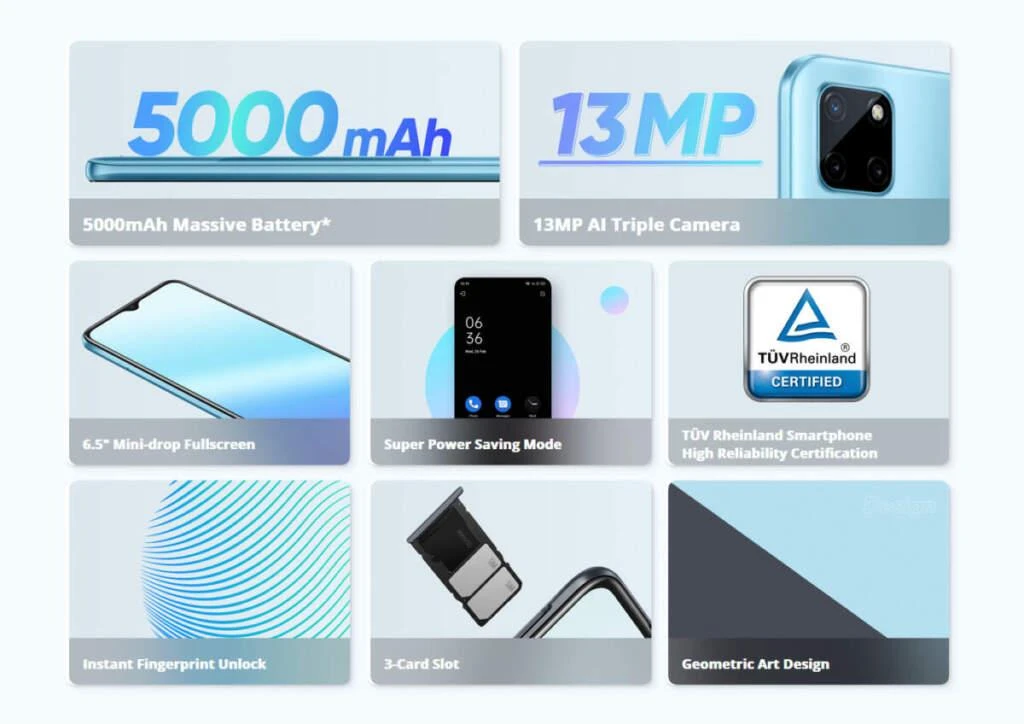 BrandRealmeSKU248189013_PK-1466013901ProtectionNot SpecifiedYearNot SpecifiedNumber Of Cameras4Battery Capacity5000 mAh & AbovePPI200-300 PPIScreen Size (inches)6 Inches & AboveSim TypeNanoRAM Memory4GBBody TypePlasticE-WarrantyYesNumber Of CoresOcta CoreVideo Resolution1080pNotchted DisplayYesHeadphone JackYesType of batteryNot Removable BatteryOperating SystemAndroidScreen TypeIPS LCDProcessor TypeOcta-coreNumber of SIM SlotsDual