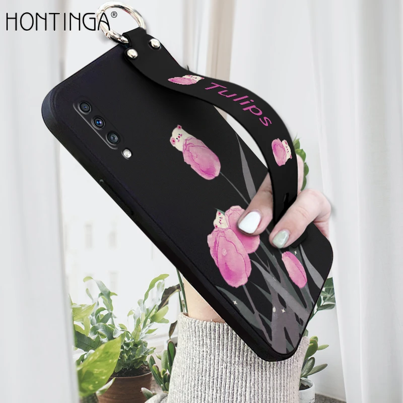Product details of Hontinga for Samsung Galaxy A70 Back Cover Wrist Strap Soft Candy Color Tulips Flower Case Square Liquid Silicone Mobile Cover