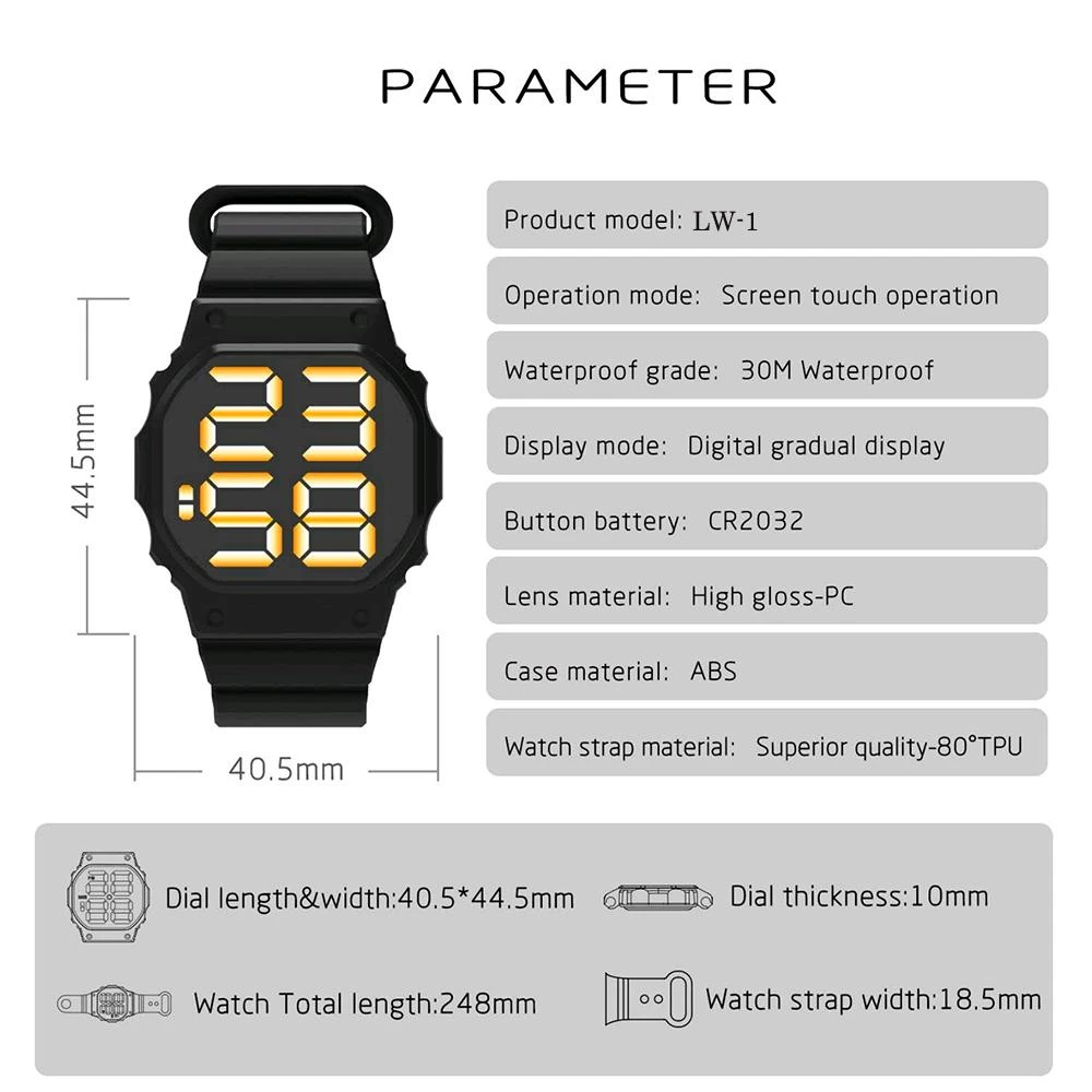 Specifications of Waterproof Sports Watch For Men Women LED Digital Touch Watch Silicone Strap WristWatch.