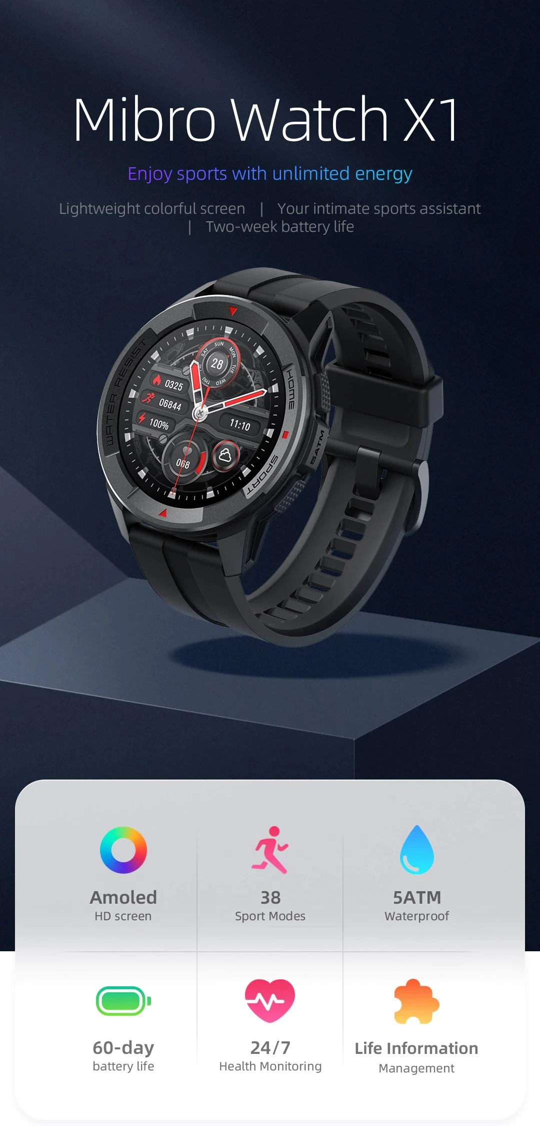 What’s in the box 1 x Xiaomi Mibro X1 Smart Watch – AMOLED HD screen – Always on Display – 15 days battery life